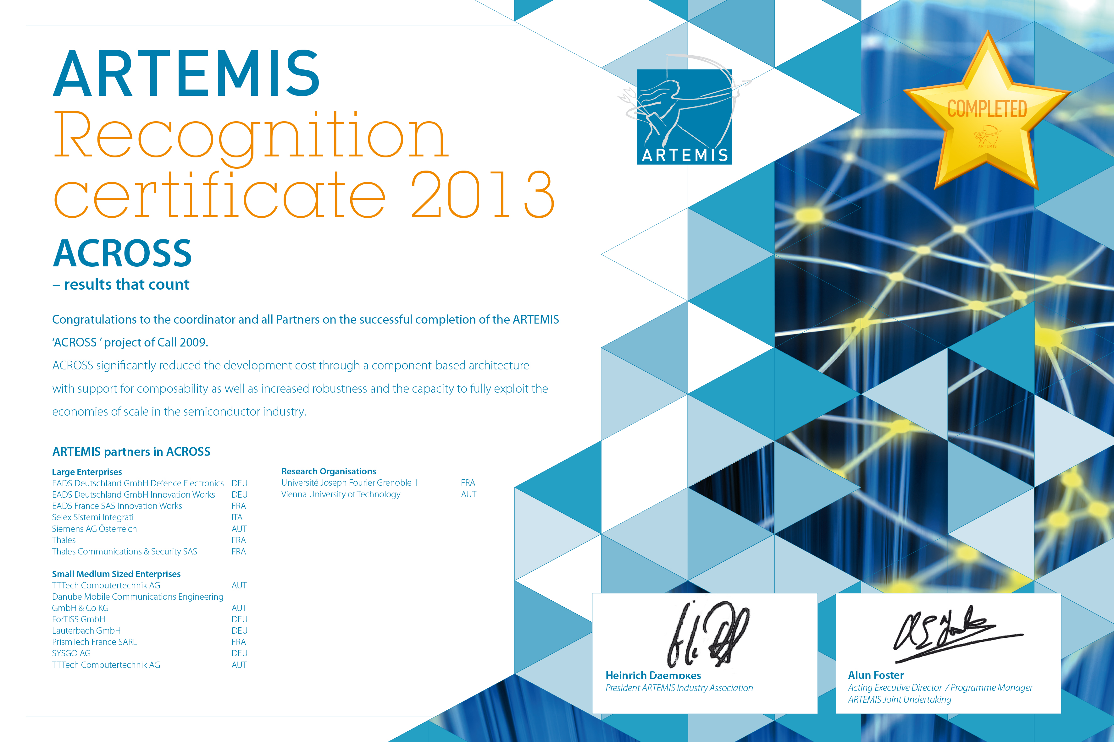 ACROSS is a research project that aims to develop and implement an ARTEMIS cross-domain reference architecture for embedded systems based on the architecture blueprint developed in the European FP7 project GENESYS.