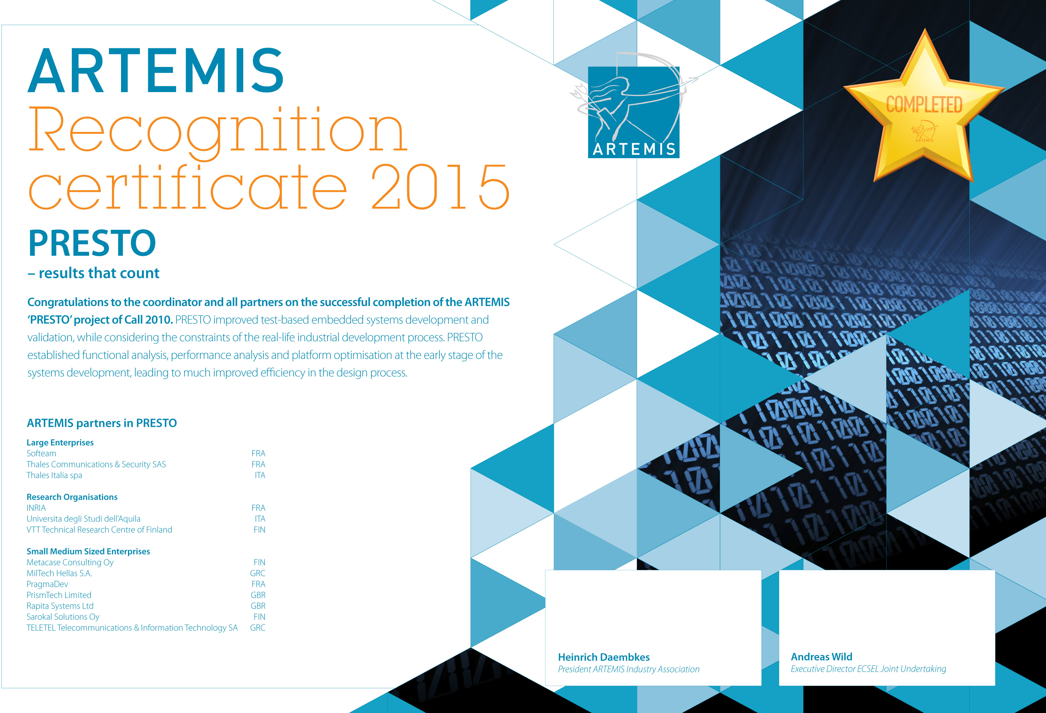 The PRESTO project aims to improve test-based embedded systems development and validation within the constraints of industrial development processes. Focusing on industrial development constraints will minimise specification time and need for expertise, keep the use of tools simple, enable smooth integration in the current design process and a versatile tool framework, design languages and integration test frameworks, and analyse results.