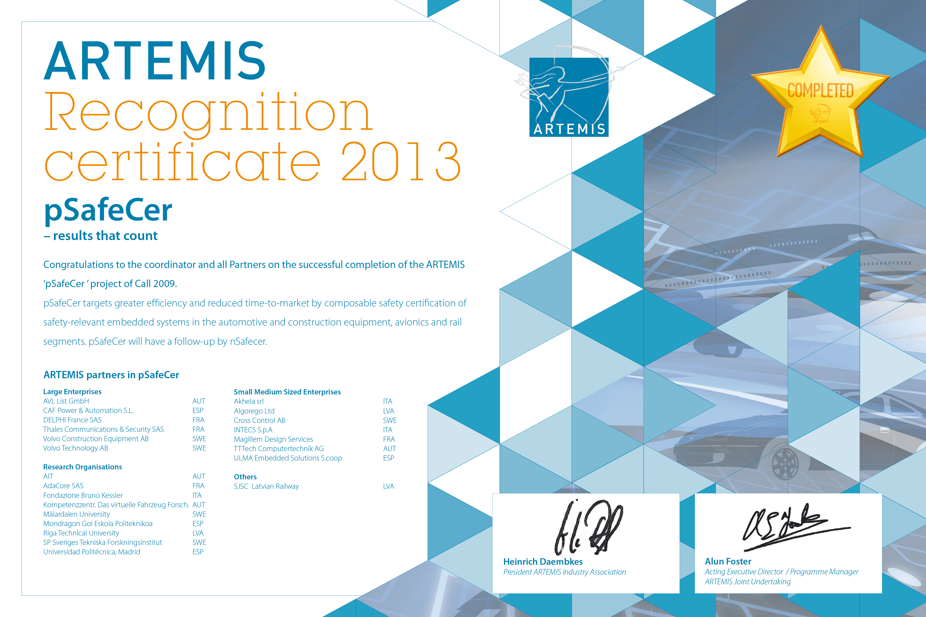 pSafeCer targets greater efficiency and reduced time-to-market by composable safety certification of safety-relevant embedded systems in the automotive and construction equipment, avionics and rail segments. pSafeCer will also develop certification guidelines and a training example for other domains, thus considerably increasing its market impact. pSafeCer brings together leading companies and SMEs across Europe along with selected universities and research institutes.