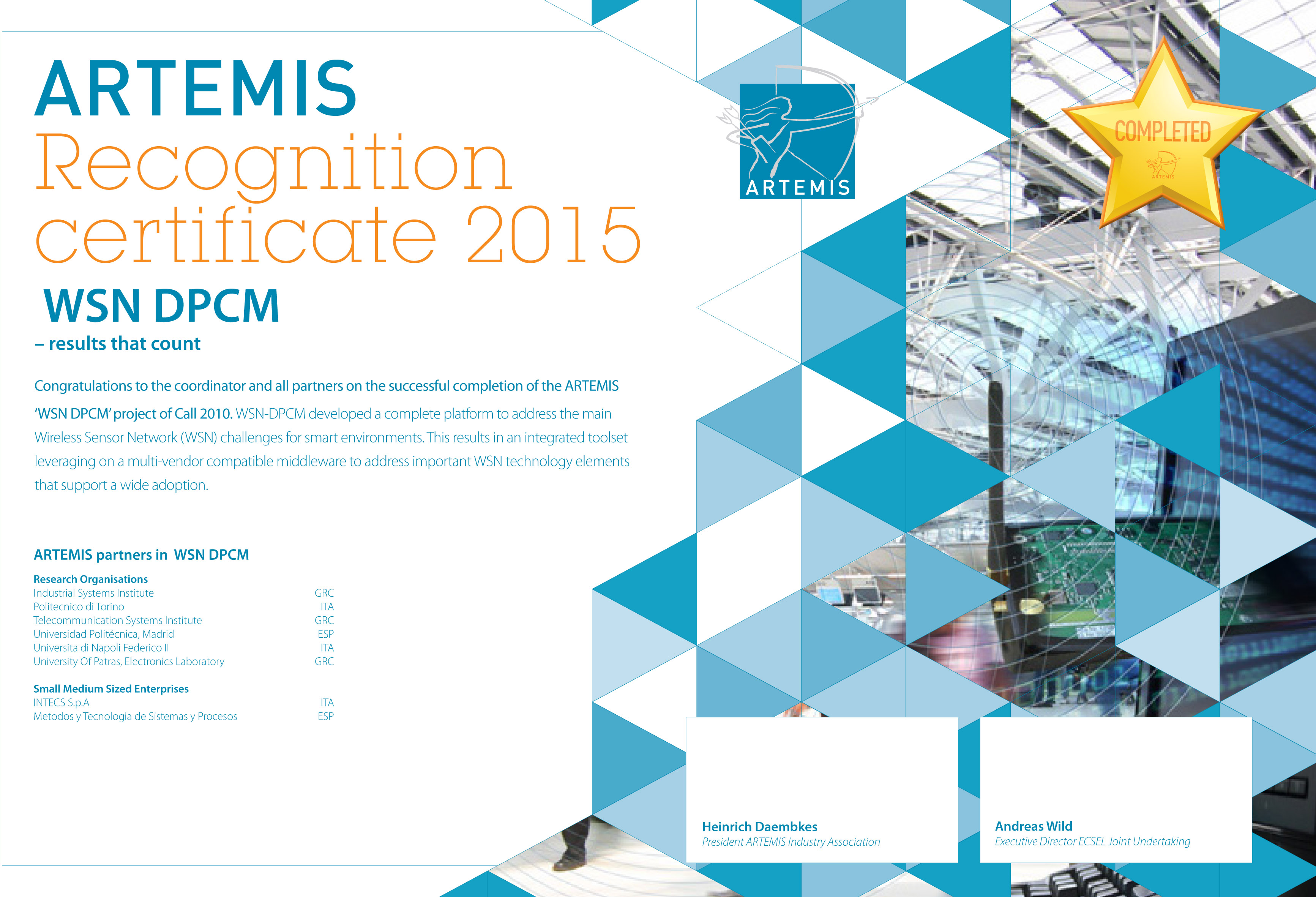 This project will address large-scale application of Wireless Sensor Networks (WSN) by developing an integrated platform for smart environments comprising a middleware for heterogeneous wireless technologies, an integrated engineering tool for quick system development, a planning tool and a commissioning & maintenance tool. Two demonstrators will be built to evaluate the impact of the middleware and tools.